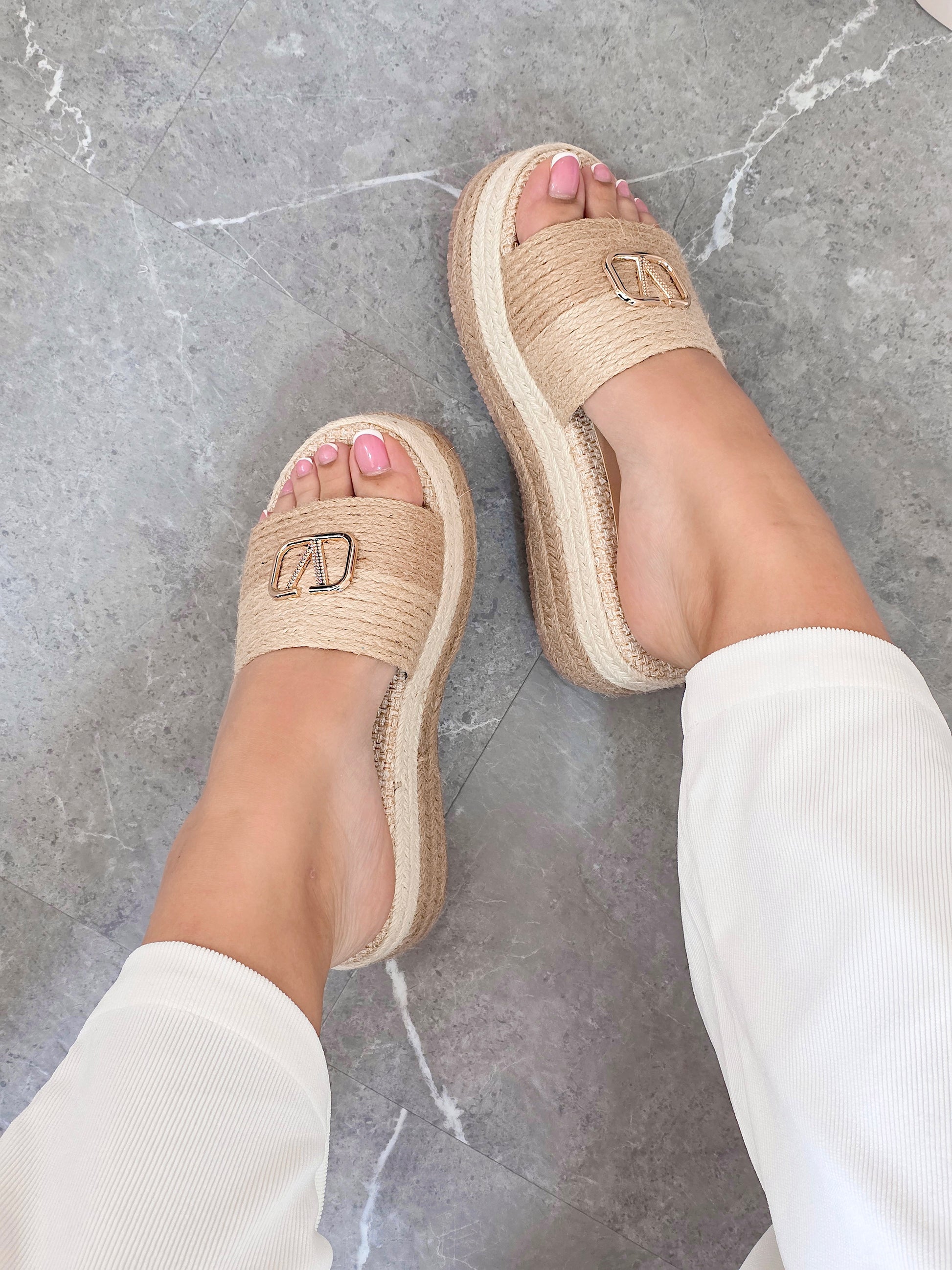 La plataforma forrada con yute proporciona altura y comodidad al caminar, mientras que la plantilla acolchada garantiza una pisada suave y confortable. Ideal para looks veraniegos, casuales o bohemi.