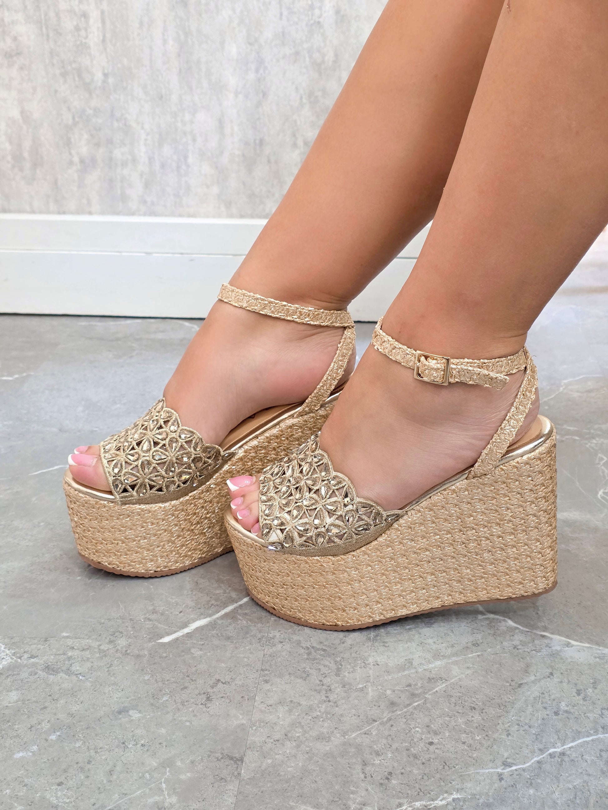 Luce radiante con estas plataformas de yute que combinan lo natural con un toque de glamour. En la parte delantera, una banda adornada con brillantes diamantes dorados añade un destello sofisticado, perfecto para elevar cualquier look. La correa trasera asegura el talón con firmeza, brindando comodidad y soporte al caminar. Ideales para eventos especiales o para destacar en un día soleado con estilo y elegancia.