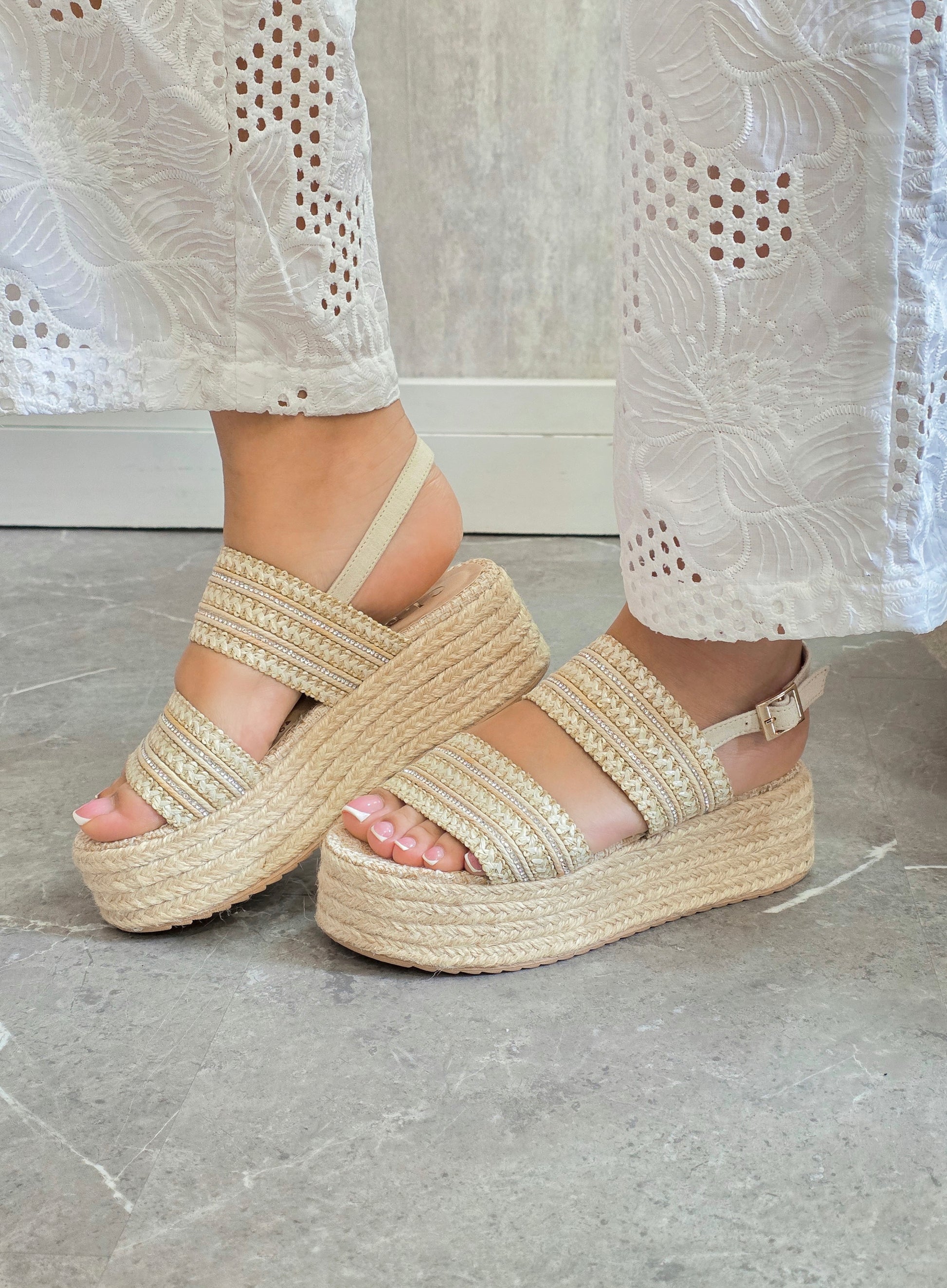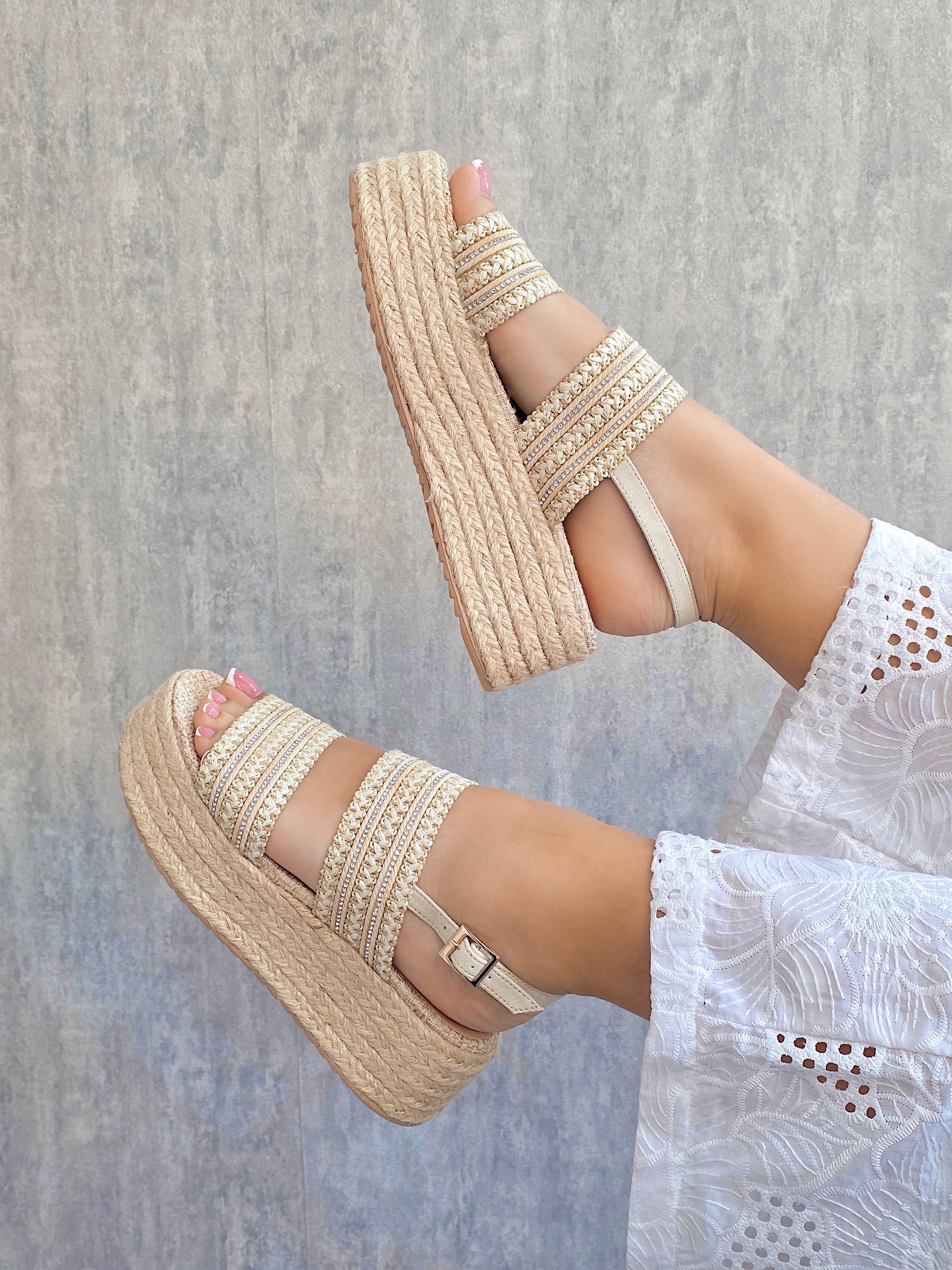 Estas elegantes plataformas de yute combinan estilo artesanal y diseño moderno para ofrecerte un calzado cómodo y versátil. En la parte delantera, dos tiras anchas cruzadas sujetan firmemente el pie, brindando soporte y un toque de textura trenzada. Una tercera tira se extiende hacia el tobillo, formando una pulsera ajustable que asegura una mayor estabilidad y un calce perfecto. Con su suela de plataforma forrada en yute natural, estas sandalias aportan altura sin sacrificar comodidad, siendo ideales para looks frescos, bohemios o de verano. Perfectas para usar con vestidos, faldas midi o jeans, son un básico imprescindible para la temporada.