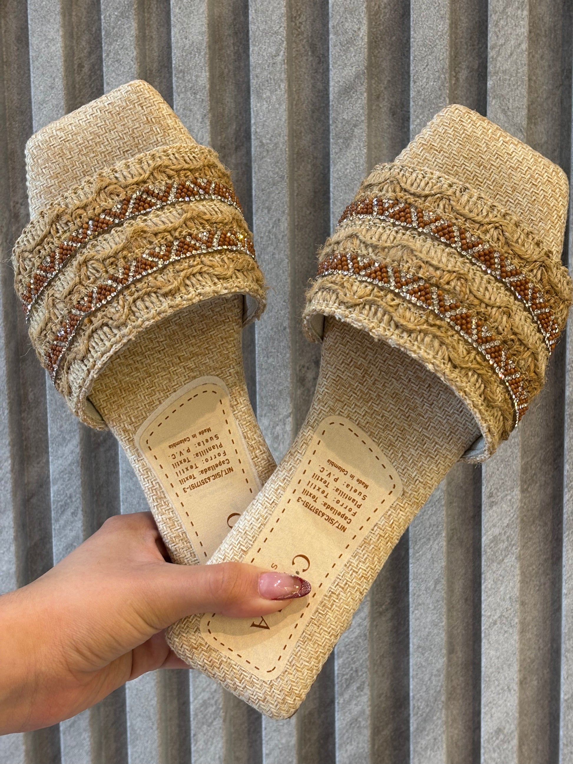 Estas sandalias planas de la marca CLEA destacan por su diseño único y lleno de carácter. Confeccionadas en un textil tipo yute de color beige claro, cuentan con una banda frontal decorada con elementos circulares tejidos en cuerda natural, embellecidos con aplicaciones metálicas doradas que capturan la luz y atraen las miradas.