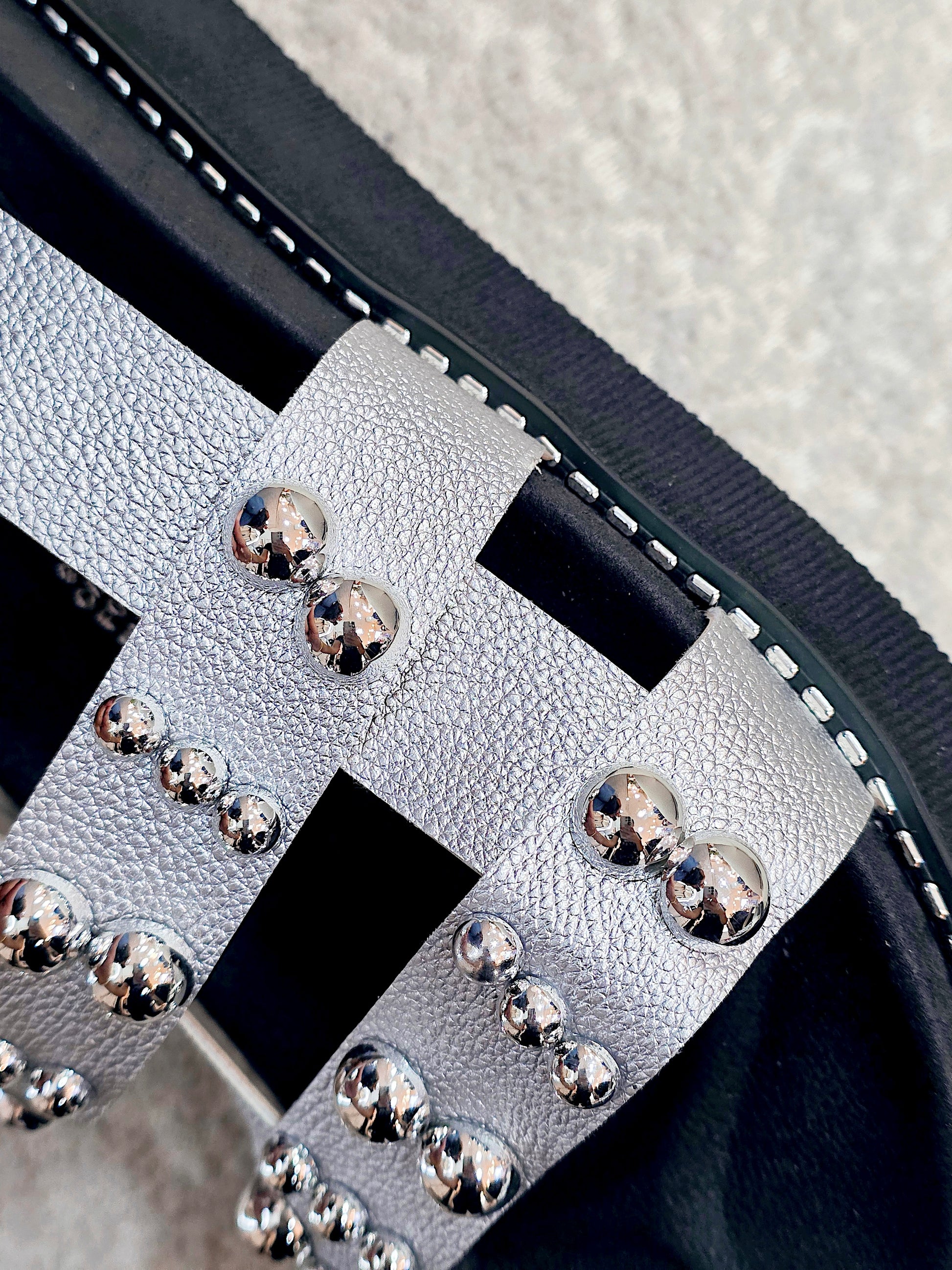 Estas sandalias tipo flat combinan comodidad y estilo con un diseño contemporáneo. Elaboradas en material sintético texturizado con acabado metálico, presentan tiras anchas decoradas con apliques de esferas cromadas que le dan un toque moderno y llamativo. Las aplicaciones metálicas están dispuestas en líneas simétricas que aportan dinamismo visual y un aire vanguardista al calzado.