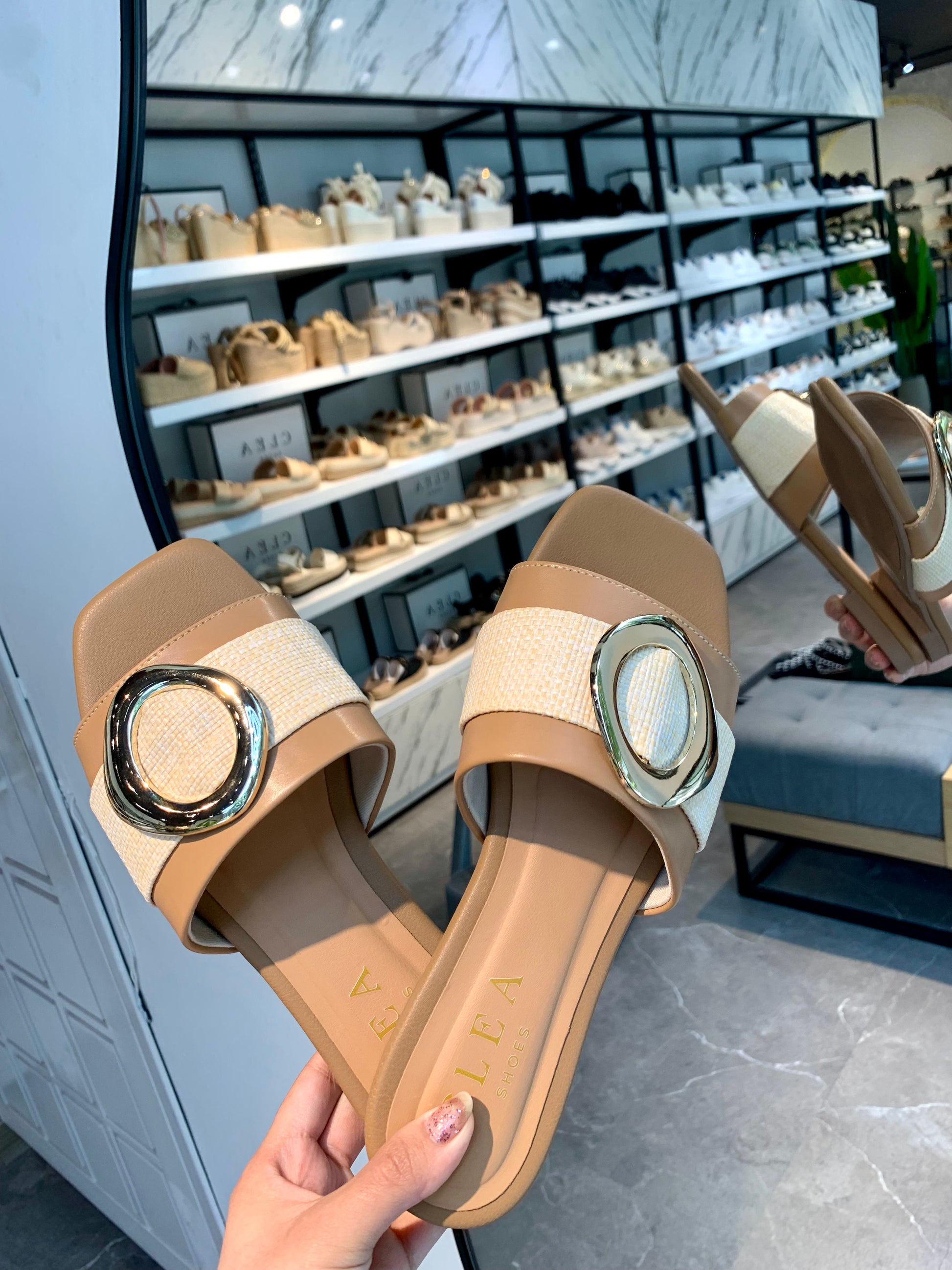 Sandalia plana tipo slide en color camel con tira ancha tejida y elegante adorno circular metálico dorado. Diseñada para ofrecer estilo y comodidad, esta sandalia es ideal para looks casuales con un toque sofisticado.