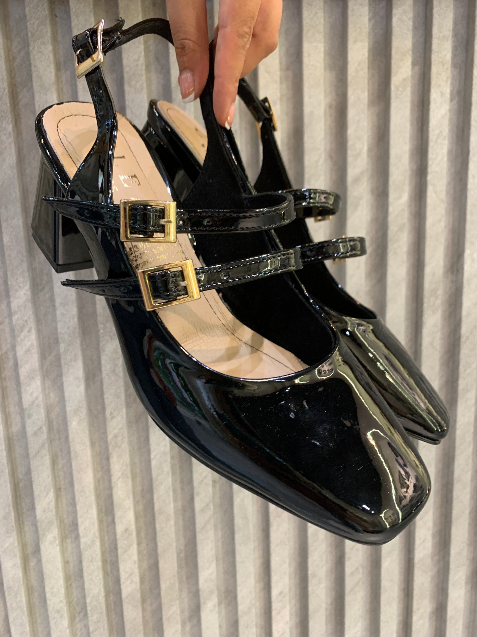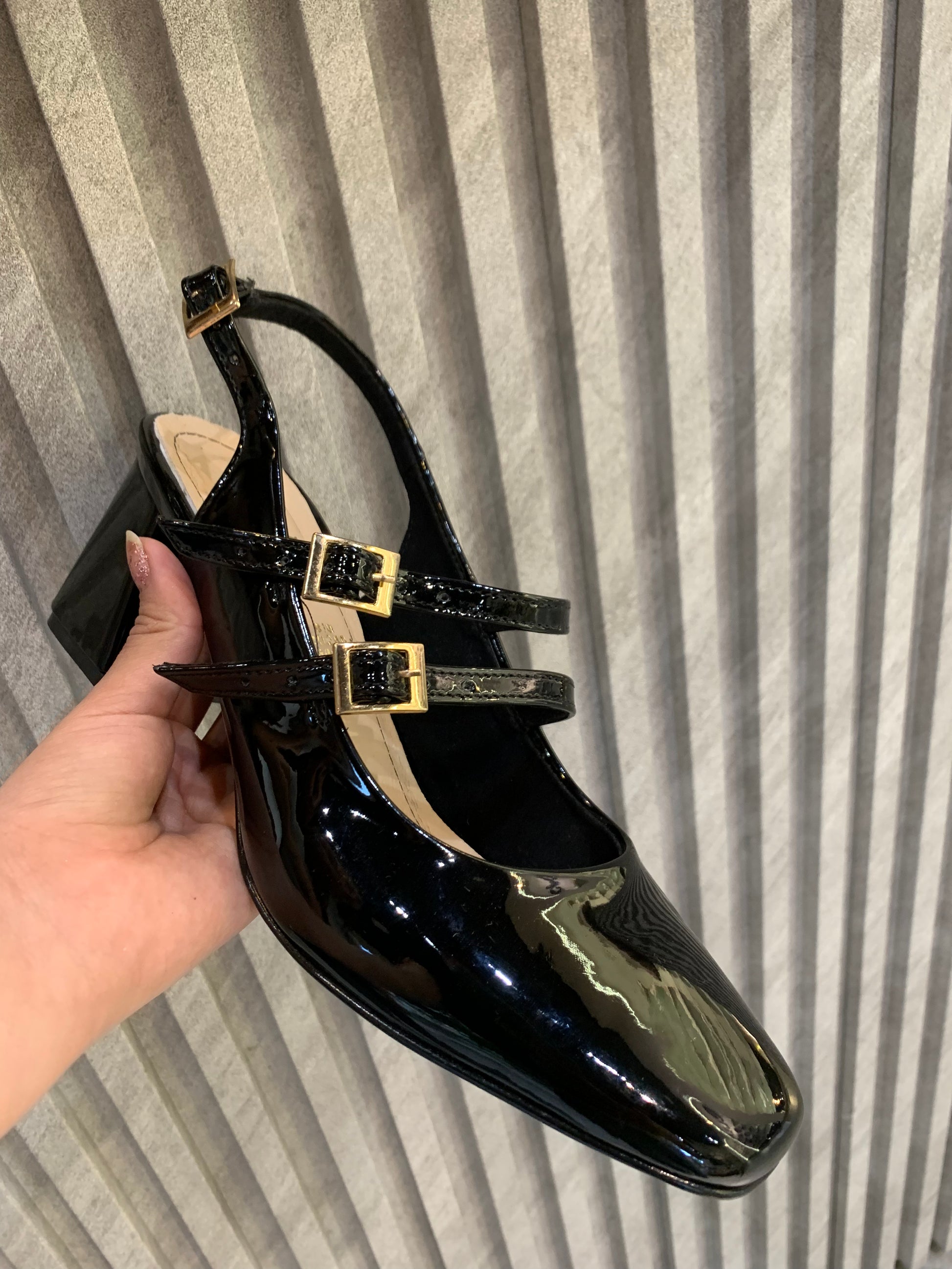 Elegante tacón confeccionado en charol brillante, ideal para lucir en ocasiones especiales o estilizar un look sofisticado. El diseño cuenta con el frente cerrado que aporta un toque clásico y refinado. En la parte superior dos correas cruzadas sobre el empeine añaden estilo y sujeción realzando la silueta del pie. En la parte trasera una correa ajustable asegura el talón brindando comodidad y estabilidad al caminar.